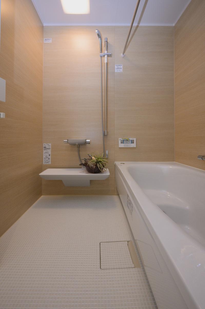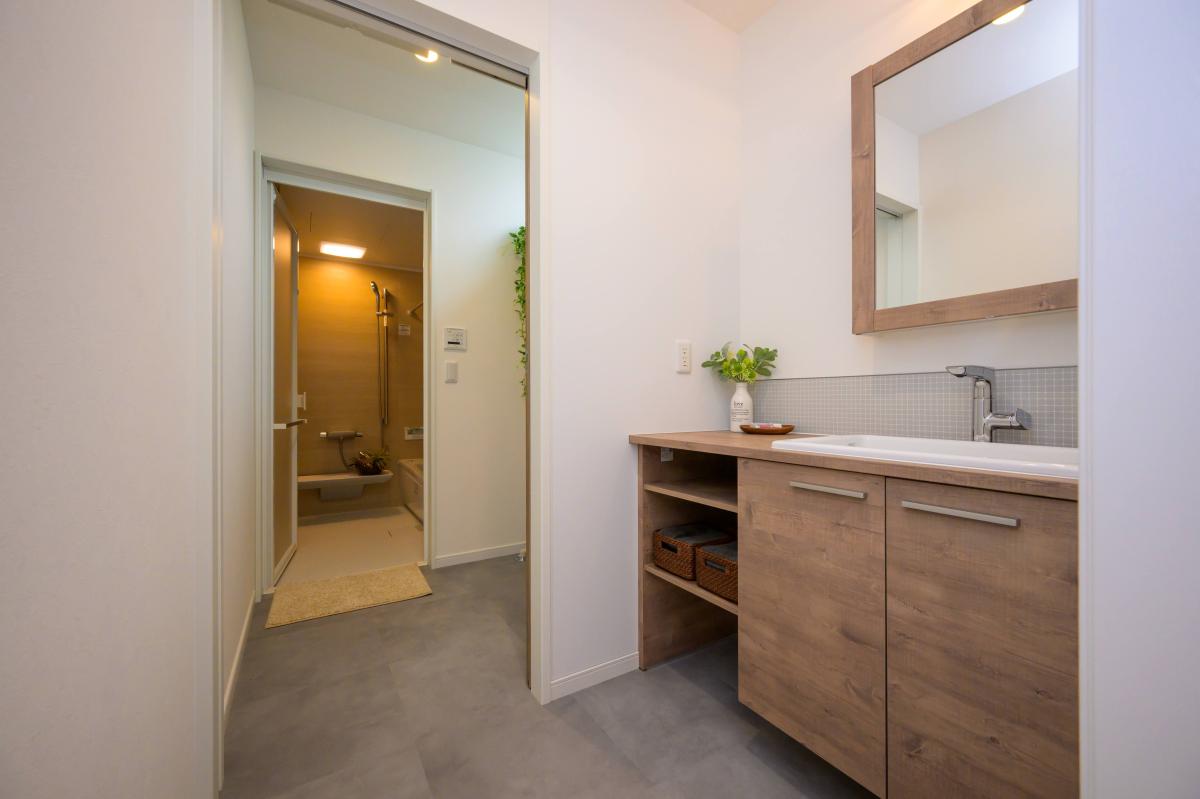 洗面スペース→脱衣スペース→浴室と一直線に配置された間取り。