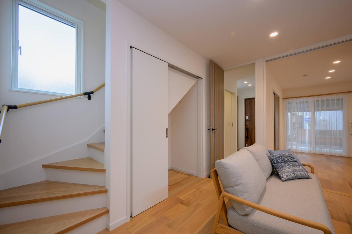 階段下は収納として有効活用。階段に設置した窓から入る光はリビングにもよく届きます。