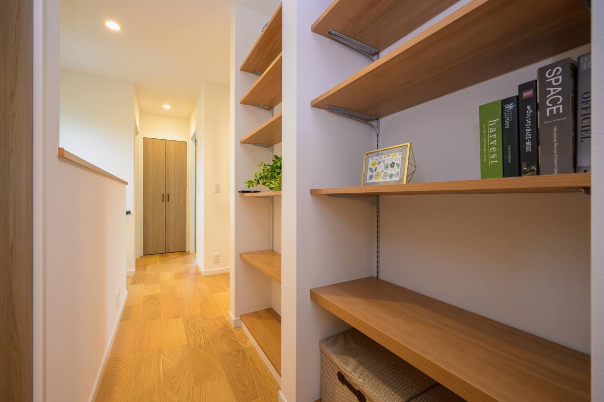2階に上がると廊下には共有で使える稼働棚。
