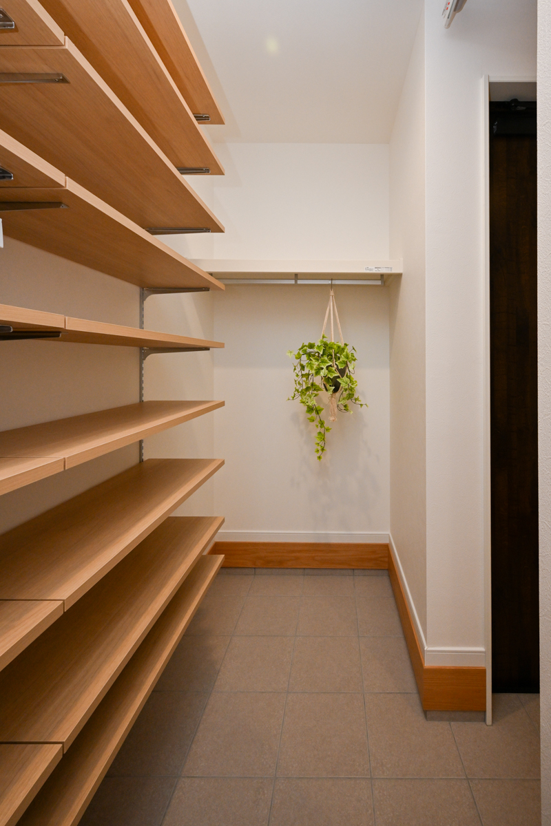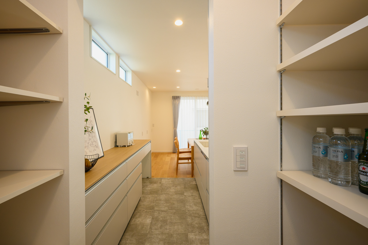 キッチンを抜けると両側稼働棚のパントリー。扉もなく使いやすく、リビングからは見えにくい位置のためキッチンがスッキリ‼