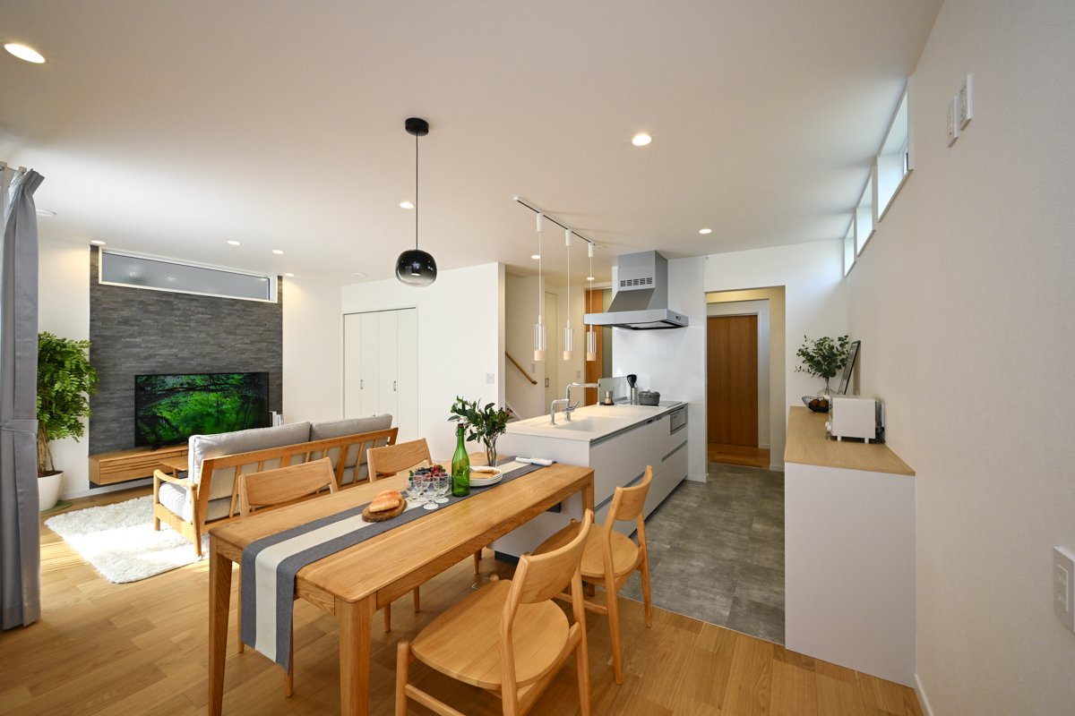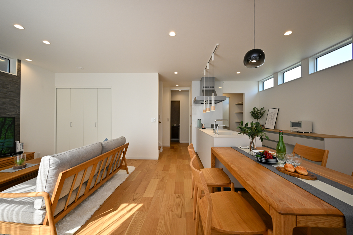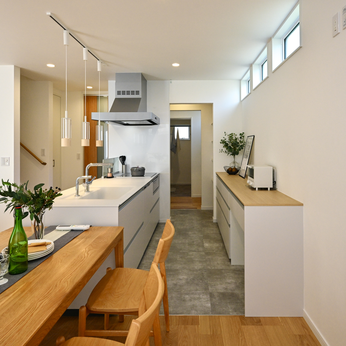 また、各所に充実した収納を設けることで、物が増えやすいファミリー世帯でもすっきりと暮らせる工夫を施しました。1階は回遊動線を採用し、家族それぞれの動きが重ならず、日々を快適に過ごせる間取りとなっています。