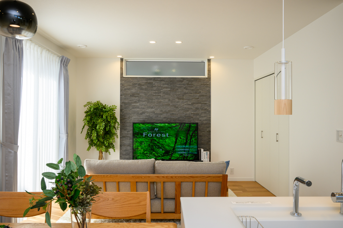 テレビの背面はエコカラットを採用しLDK空間のアクセントに。