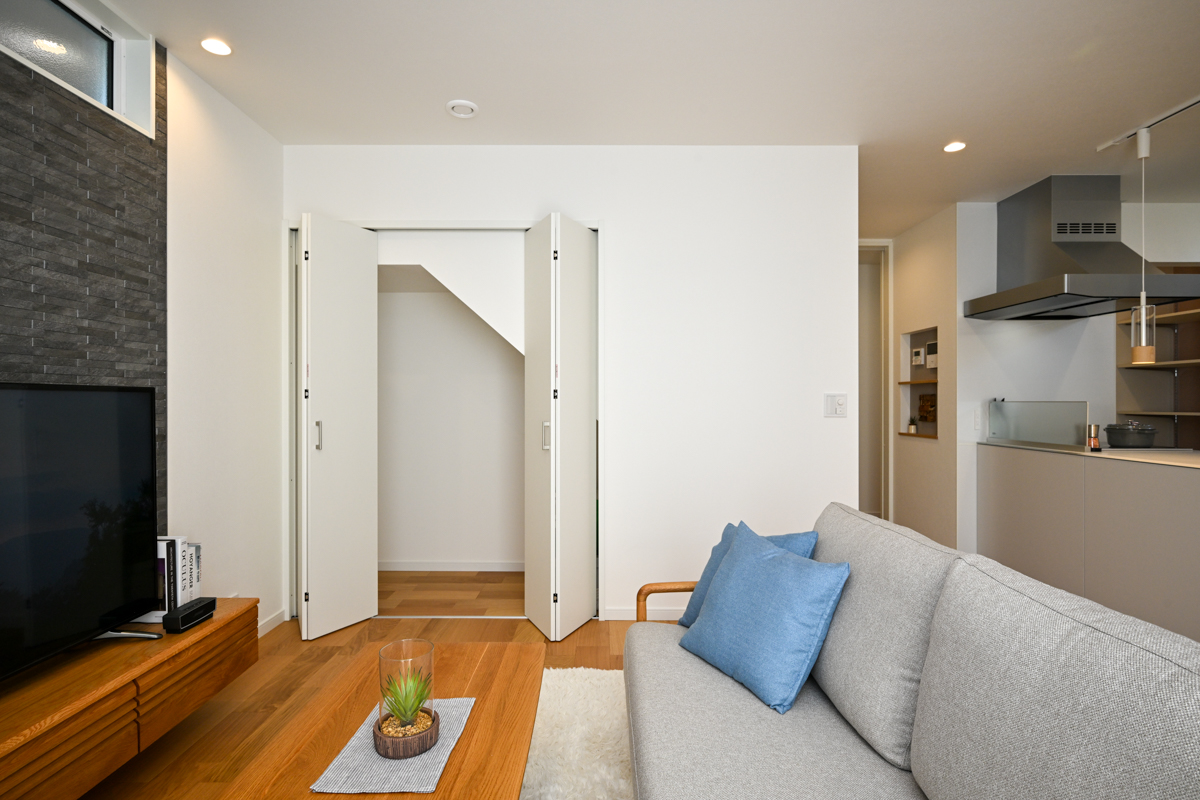 階段下も有効活用し収納にすることで、片づけやすく生活感のないリビングへ。