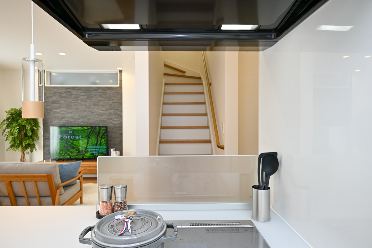 2階へはキッチン前の階段から。高気密・高断熱のため2階との温度差を感じにくく、リビング階段のデメリットを解消‼