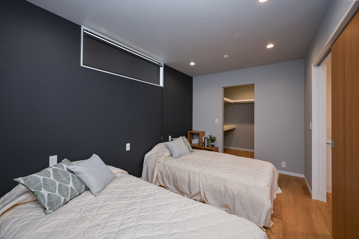 2階の主寝室。1階とは違いグレーやネイビーカラーを採用し、落ち着ける部屋に。