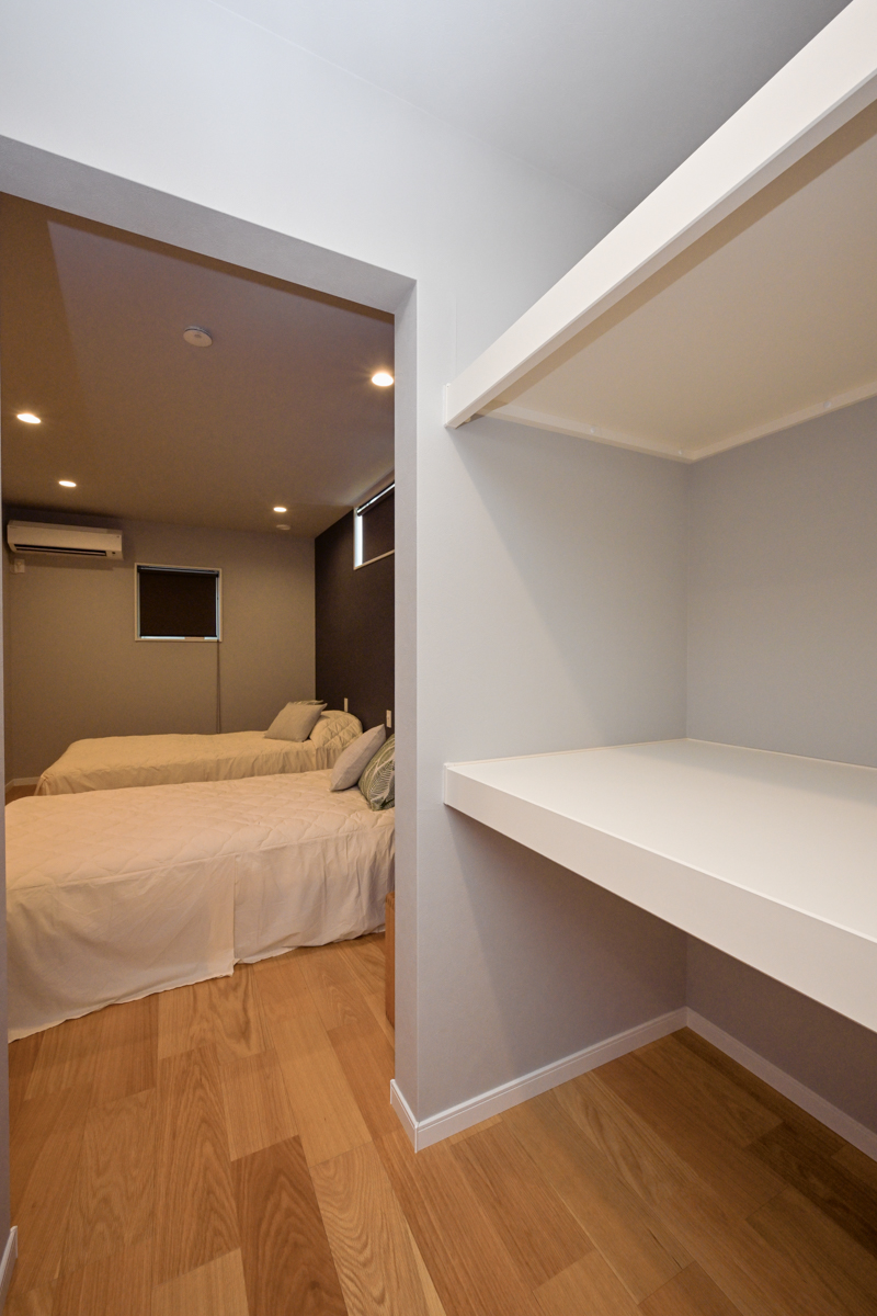 WICは寝室からL字型に繋がっており、手前は奥行きのある棚が2段。