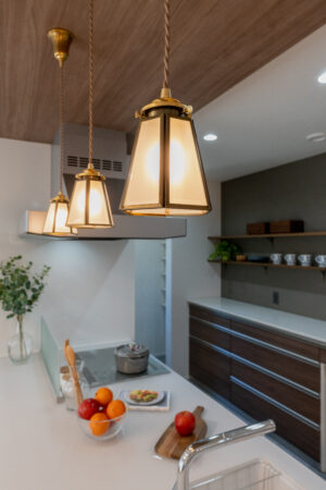 M様邸のキッチンには、趣のあるペンダントライトがついております。