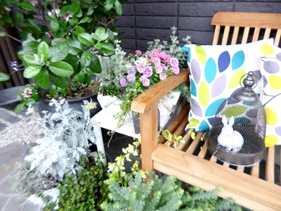 弊社事務所前です。 新しくしたベンチの脇に植物がいっぱいです。 ちなみに、事務所の中にもたくさんの観葉植物があり、緑に囲まれて仕事をしています。 植物を眺めていると、とても癒されます。 事務所の前には本当にたくさんの緑があります。 事務所にお越しいただいた方はもちろん、通りすがりの方にとっても癒しになればいいなと思います。