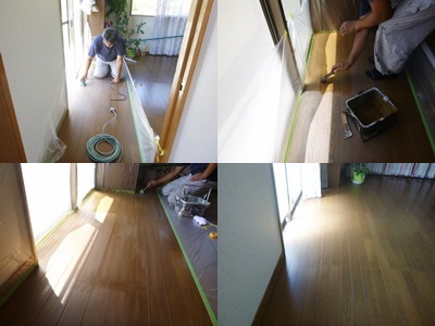 表面をペーパーで擦り、着色してクリアー塗装をして仕上げます。既存の床との色合わせと仕上がりは、職人さんの腕の見せ所です。
