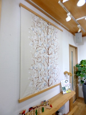 タペストリーを掛けてみました。 生地はマリメッコのルミマルヤという生地です。 ルミマルヤとは、『雪いちご』という意味だそう。 木に雪が積もってるようで、色合いもこれからの季節にピッタリな感じです。