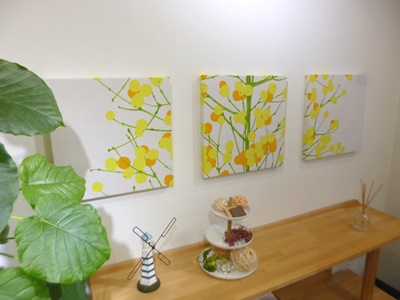 ファブリックパネルの春バージョンを作ってみました。 マリメッコのルミマルヤという生地です。 今までは、同じ柄で冬らしいシックな色合いのパネルを飾っていました。