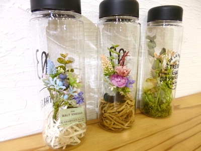 写真のような、透明のボトルにお好みの素材(フェイクの花、植物など)を入れてオリジナルボトルを作ります。 中に入れる物の種類が多いので迷ってしまいそう! でも、その迷っている時間が楽しいんです。