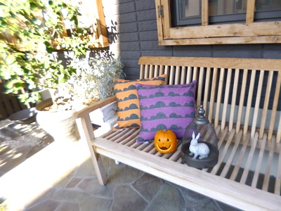 もうすぐハロウィンですね。 弊社の事務所前です。 事務所前のベンチにあるクッションカバーは季節、イベントに合わせて替えています。 というわけで、現在はハロウィン仕様です。 ハロウィンっぽい色合いのカバーにしてあります。