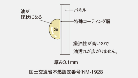 ライトキッチンパネル 特殊コーティング層が油分をはじき、汚れがこびり付きにくく、サッとふき取れるキッチンパネルです。