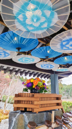 寒空の下、階段を上り本殿前の手水舎には色鮮やかなお花が✨