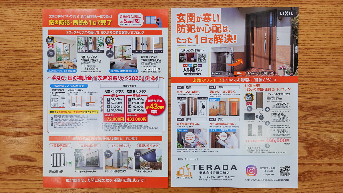 そして窓や玄関ドアのリフォームについてのチラシを今回は同封いたします。