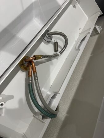 ホースですが、バックパネルの中に蛇腹ホースが入っているので、多少漏れても基礎が水浸しになってしまわないような構造になっております。