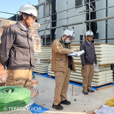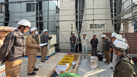 新築工事の建て方作業前に必ず行っている朝一ミーティングの一幕です。