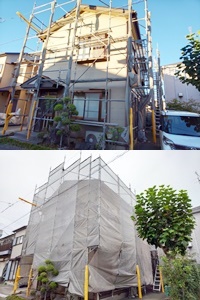 台風も去り、明日は外部の高圧洗浄を行いますが、台風養生の為に足場のメッシュシートを畳んであったので、張り直して明日の準備完了です。