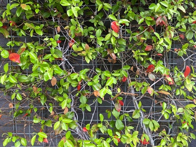 事務所前のテイカカズラの葉に赤い葉が見られるようになると
