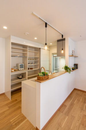 ちなみにキッチン背面の収納は扉を閉めるとぐっとオシャレに日常感をなくすことが出来ます。