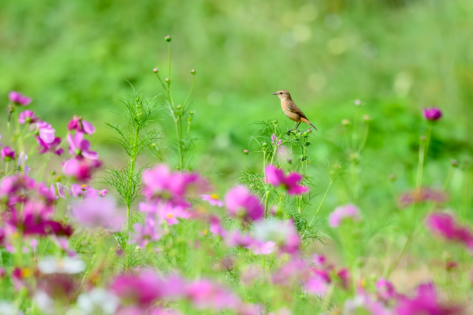 コスモスの花とノビタキ・・・秋ですね・・・。
