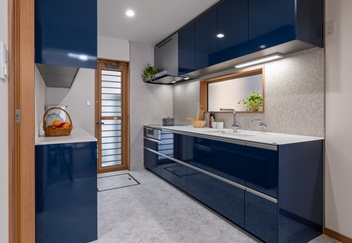 深い藍色の鏡面仕上げのこちらのキッチンは