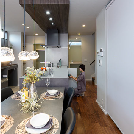 システムキッチンは勿論のこと、大容量の収納力を持っていますが、リビング壁面の収納力も抜群です。