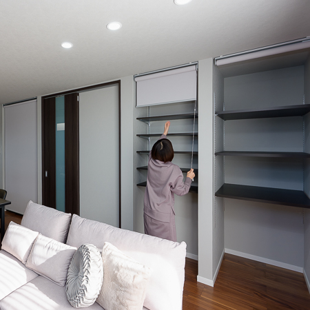 みせる収納・仕舞う収納、どちらもOKなロールカーテン仕様となっています。