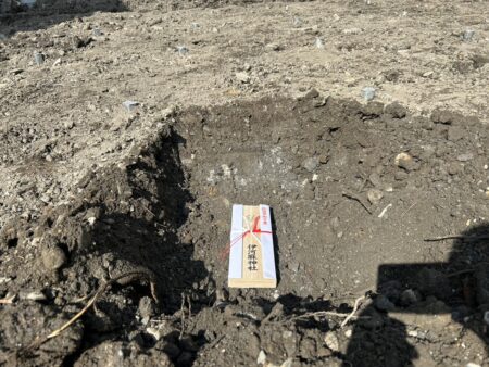 先日 地鎮祭にて神主様よりお預かりした鎮め物を建物中央に埋めました。