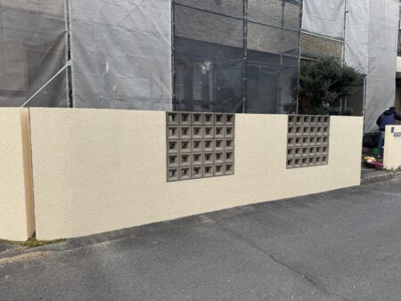 外壁の大まかな塗装が終わり、外構部分の壁を塗装しております。