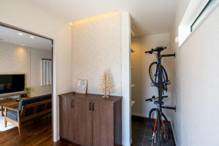 平屋づくりとなっており、玄関ホールにはお施主様の大切な自転車が2台収納可能なスタンドを備えております。