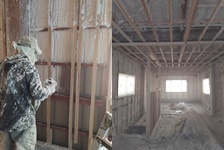 屋根150mm・壁50mmの厚さで断熱材を吹付て行きます。